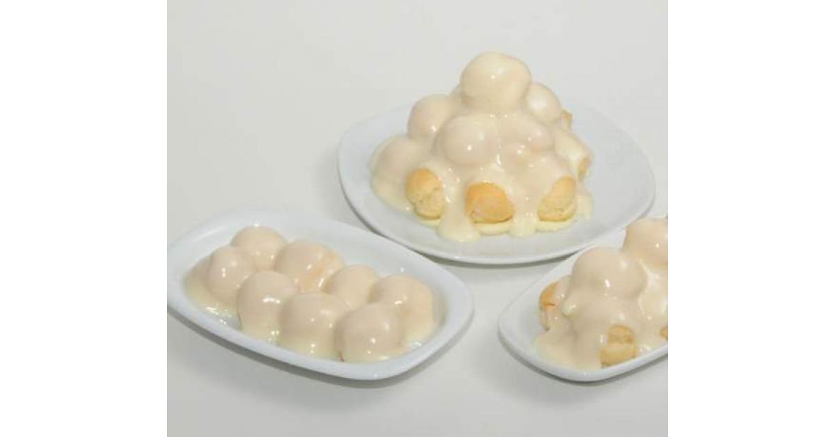 Pastry puffs filled with vanilla ice cream and dressed with warm chocolate sauce. It is hard to beat a profiterole or cream puff with hot chocolate sauce filled with a creamy custard cream.
